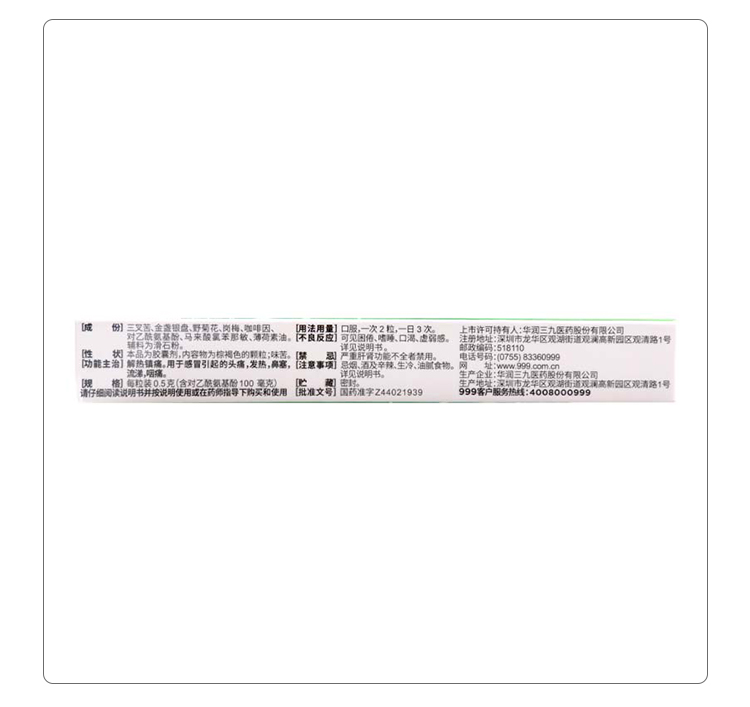 3.本品含对乙酰氨基酚、马来酸氯苯那敏、咖啡因。服用本品期间不得饮酒或含有酒精的饮料;不能同时服用与本品成份相似的其他抗感冒药;肝、肾功能不全者慎用;膀胱颈阻梗、甲状腺功能亢进、青光眼、高血压和前列腺肥大者慎用;孕妇及哺乳期妇女慎用;用药期间不得驾驶机、车、船、从事高空作业、机械作业及操作精密仪器。
