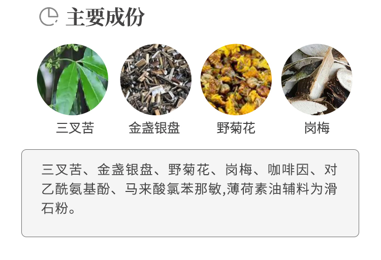 - 含量成分三叉苦、金盏银盘、野菊花、岗梅、咖啡因、对乙酰氨基酚、马来酸氯苯那敏、薄荷油。辅料为滑石粉。