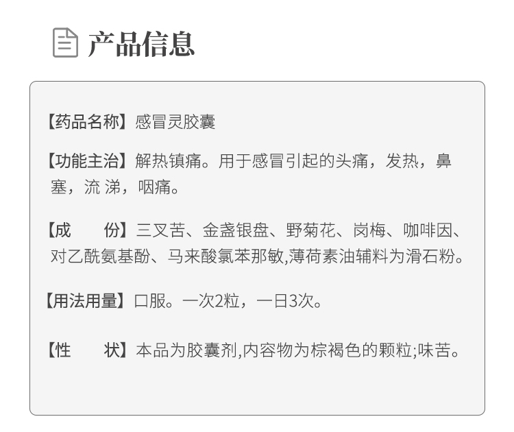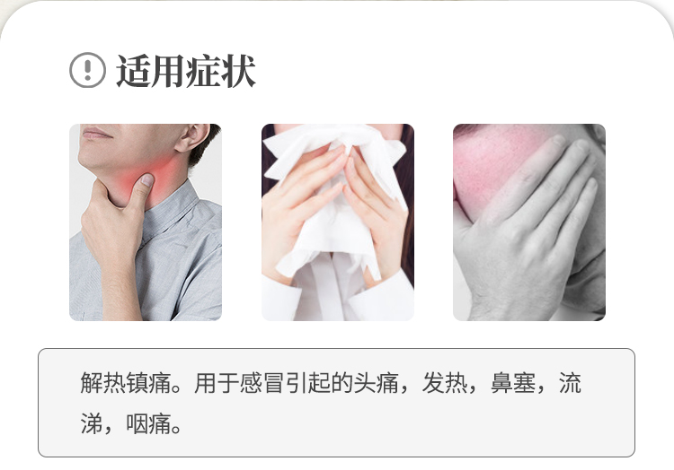 - 功能主治/适应症解热镇痛。用于感冒引起的头痛,发热,鼻塞,流涕,咽痛。